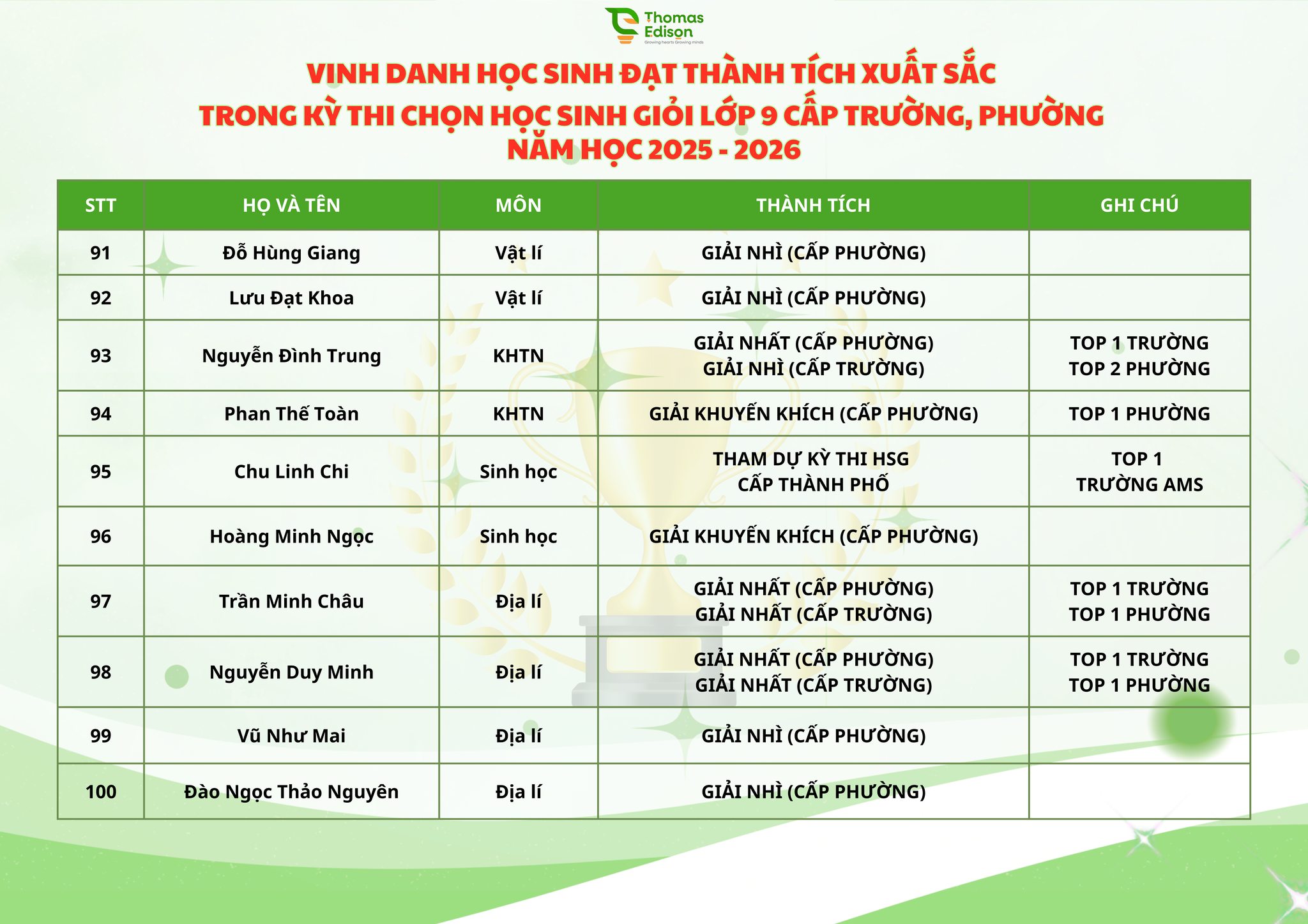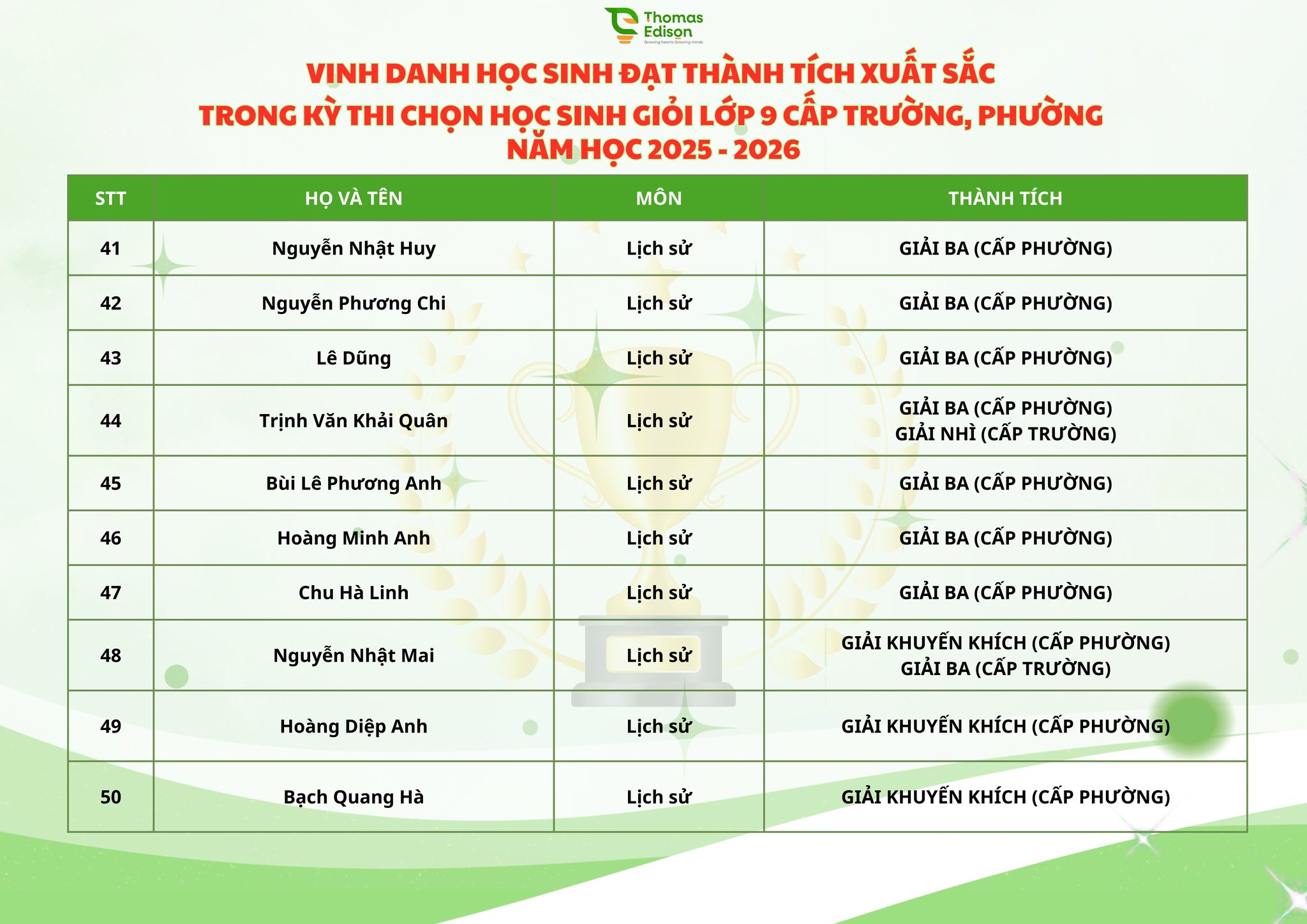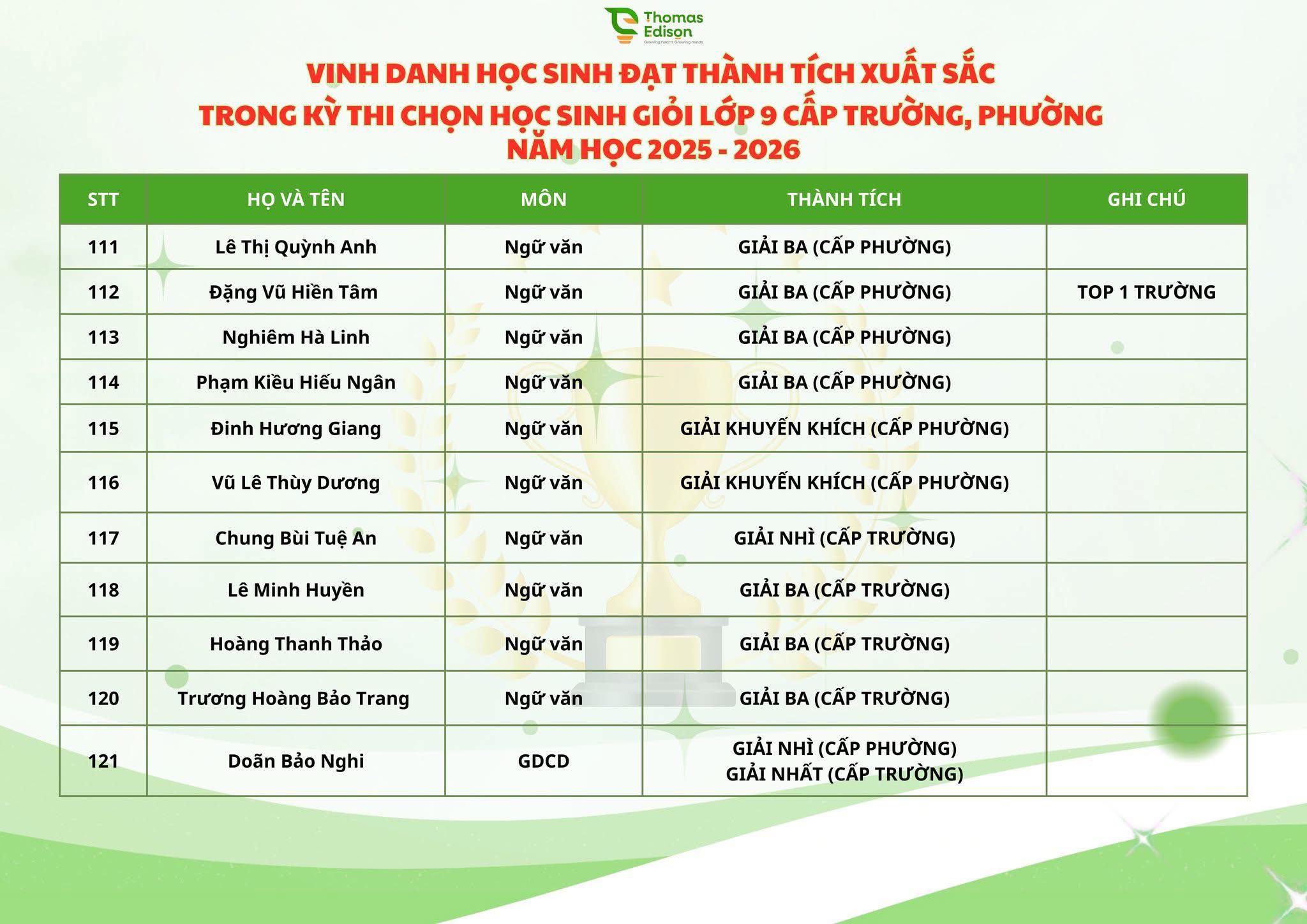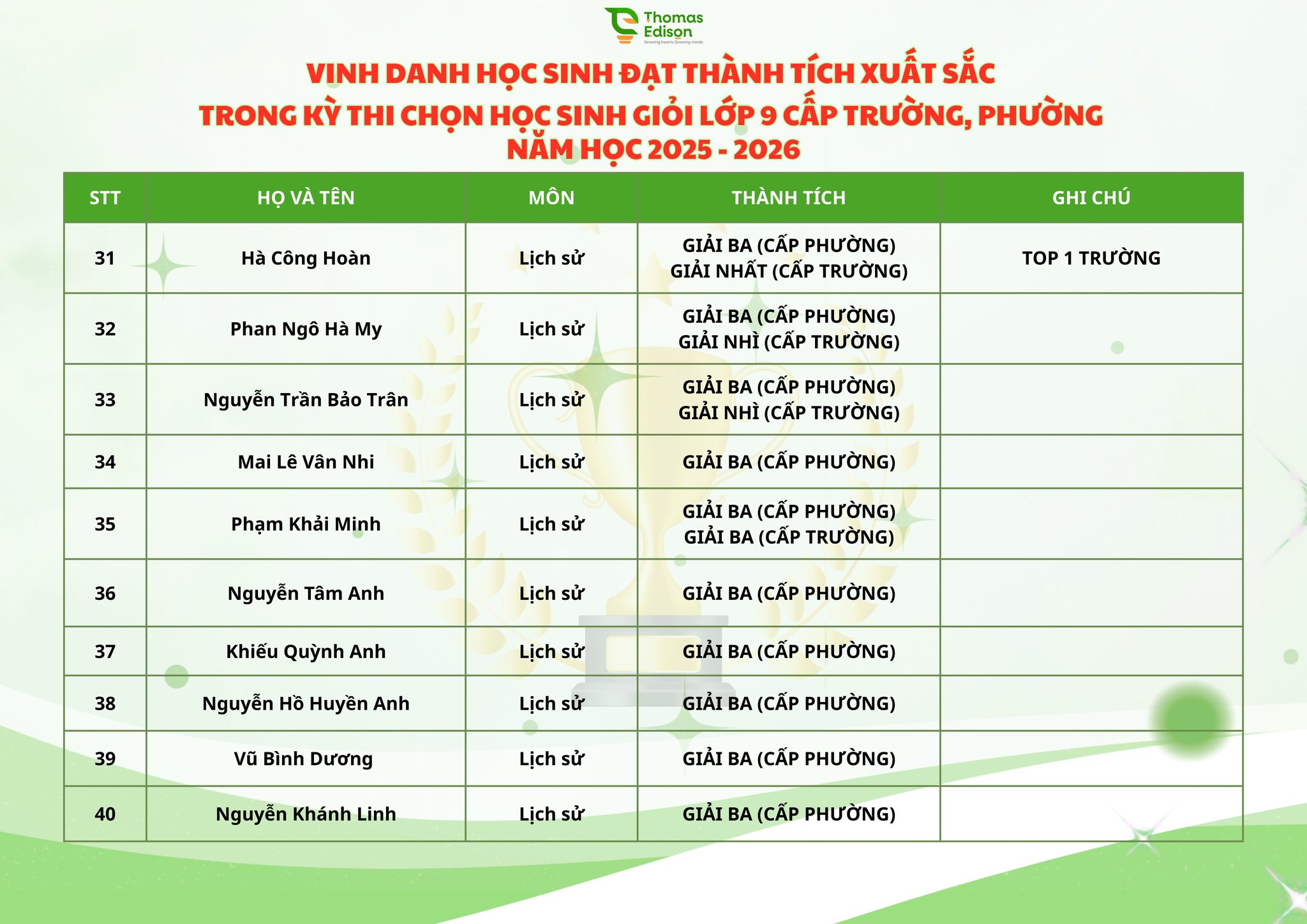 Chúc mừng 121 ngôi sao nhà Thomas Edison - chúc các con tỏa sáng trong kỳ thi HSG cấp Thành phố và tiếp tục bay cao, bay xa, luôn vững vàng, tự tin trên những hành trình chinh phục mục tiêu phía trước, nơi còn rất nhiều ước mơ đang chờ được gọi tên