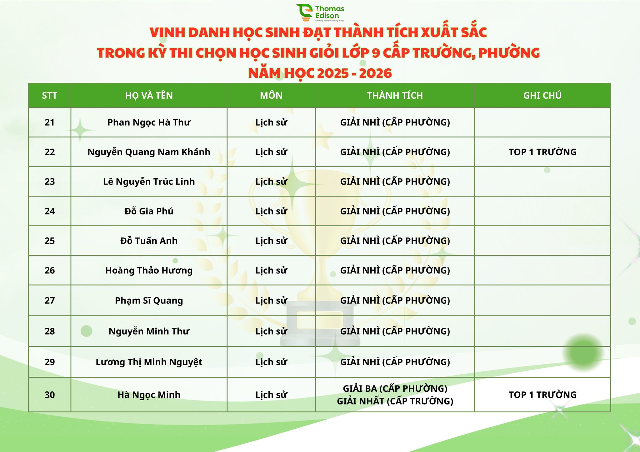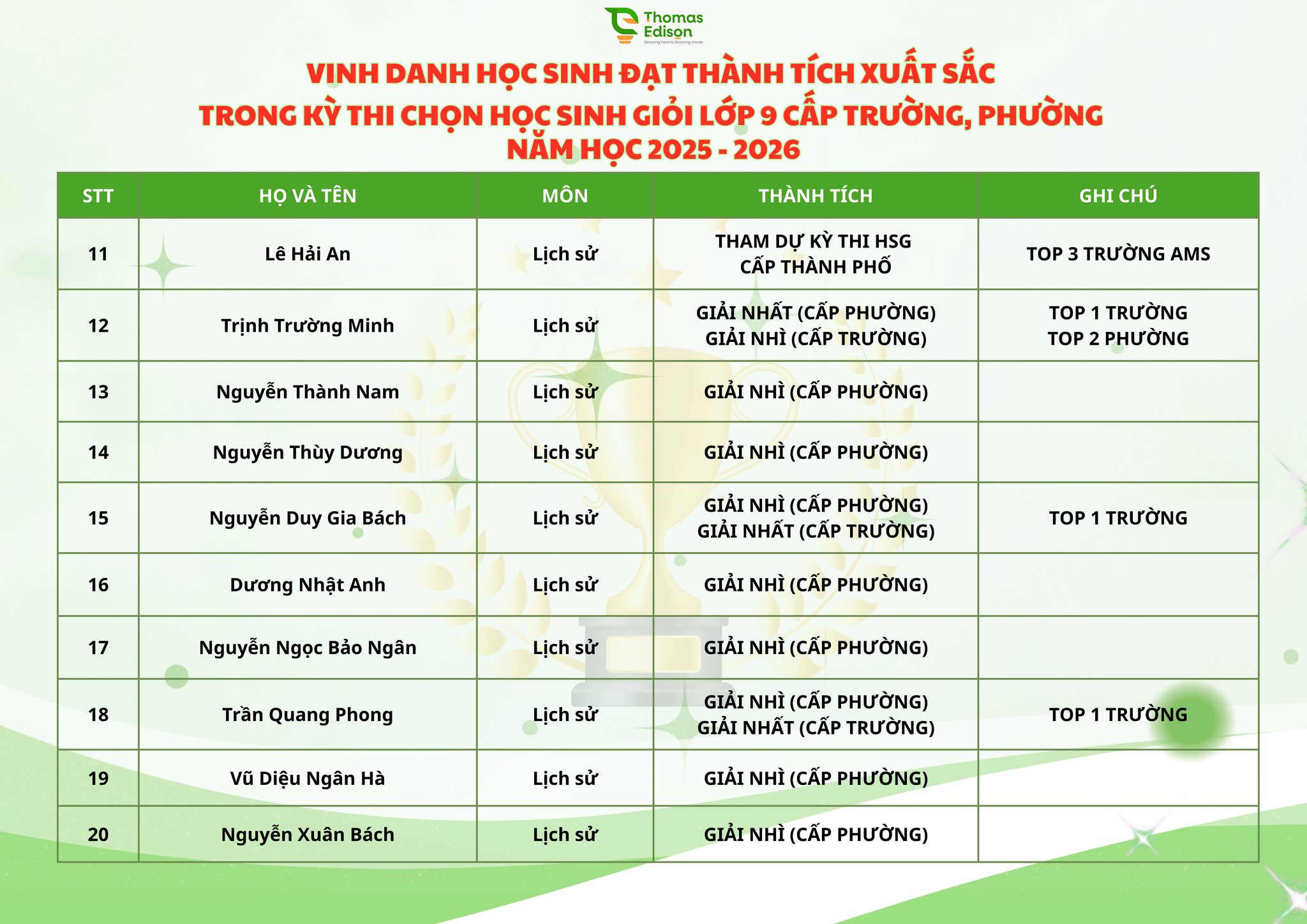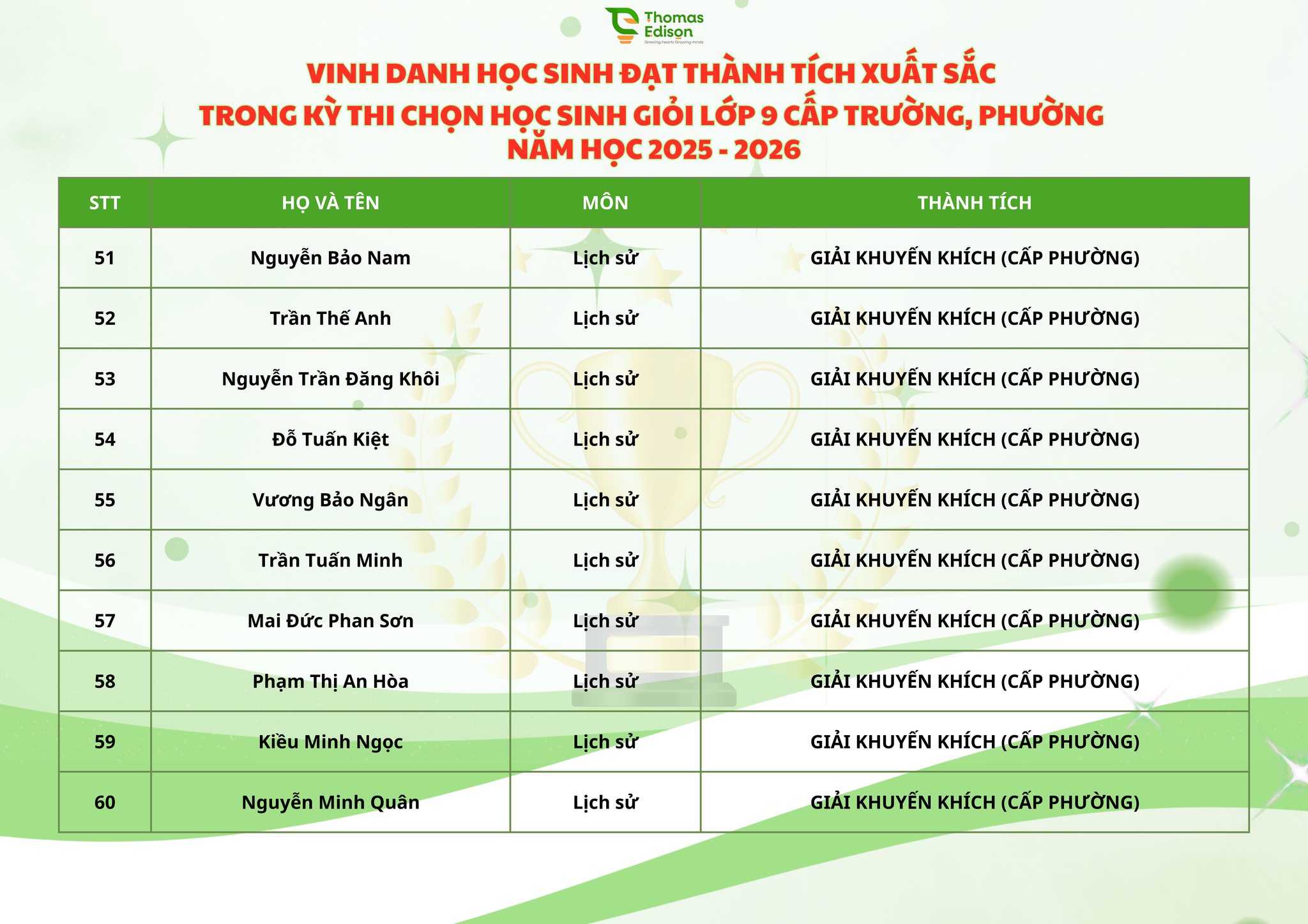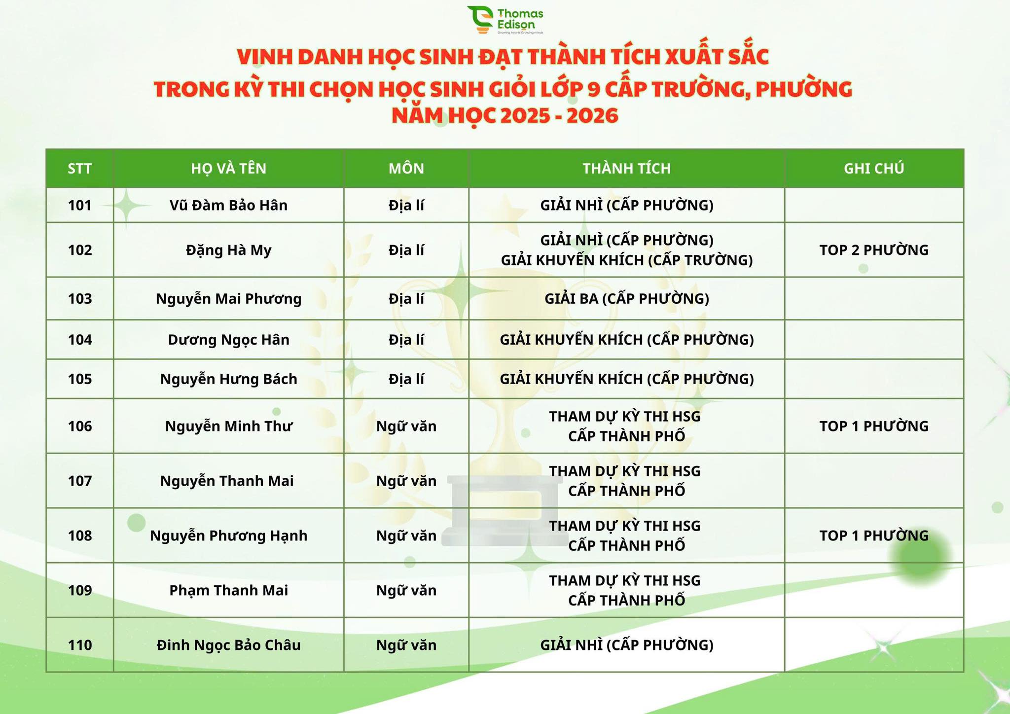 Chúc mừng 121 ngôi sao nhà Thomas Edison - chúc các con tỏa sáng trong kỳ thi HSG cấp Thành phố và tiếp tục bay cao, bay xa, luôn vững vàng, tự tin trên những hành trình chinh phục mục tiêu phía trước, nơi còn rất nhiều ước mơ đang chờ được gọi tên