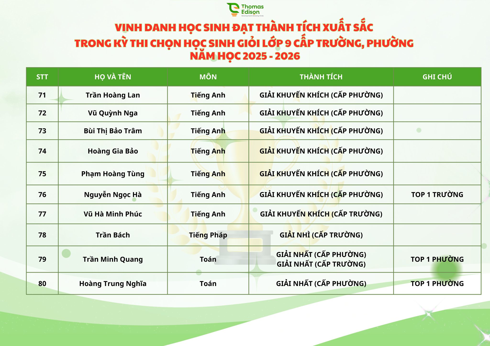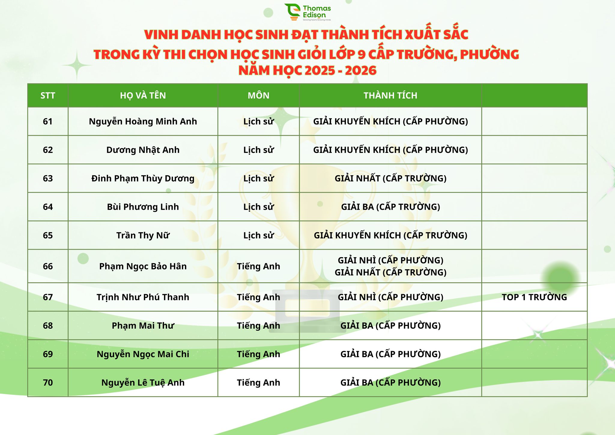 VINH DANH HỌC SINH ĐẠT THÀNH TÍCH XUẤT SẮC KỲ THI HSG CẤP TRƯỜNG, PHƯỜNG NĂM HỌC 2025 - 2026