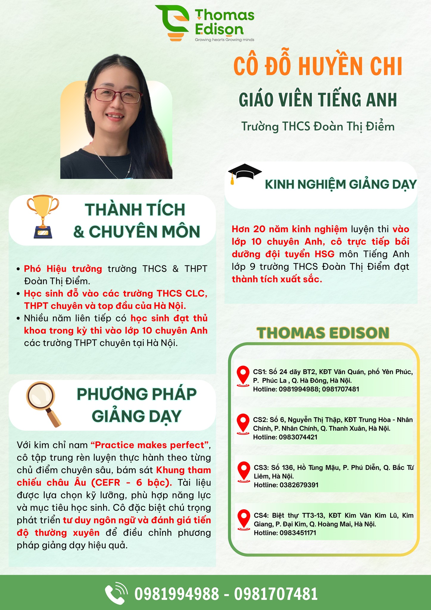 Từ những buổi rèn luyện tỉ mỉ từng kỹ năng theo chuẩn CEFR - 6 bậc châu Âu, đến việc khơi gợi tư duy ngôn ngữ và sự tự tin, cô đã giúp biết bao thế hệ học sinh chinh phục thủ khoa, đỗ vào các trường CLC, chuyên và top đầu Hà Nội.