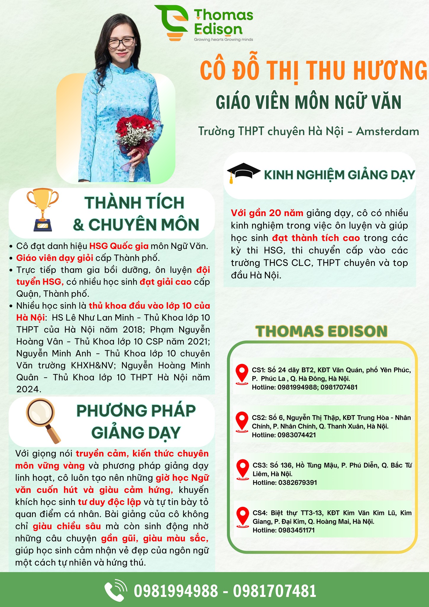 Với cô, Văn chương không chỉ là tấm vé vượt qua kỳ thi, mà còn là hành trình nuôi dưỡng tâm hồn – để các em biết cảm nhận, biết rung động, biết thấu hiểu. Khi ngôn từ trở thành người bạn đồng hành, các em sẽ tự tin bày tỏ quan điểm, lập luận sắc bén, giao tiếp rõ ràng và sẵn sàng chinh phục những mục tiêu lớn hơn trong học tập và cuộc sống.