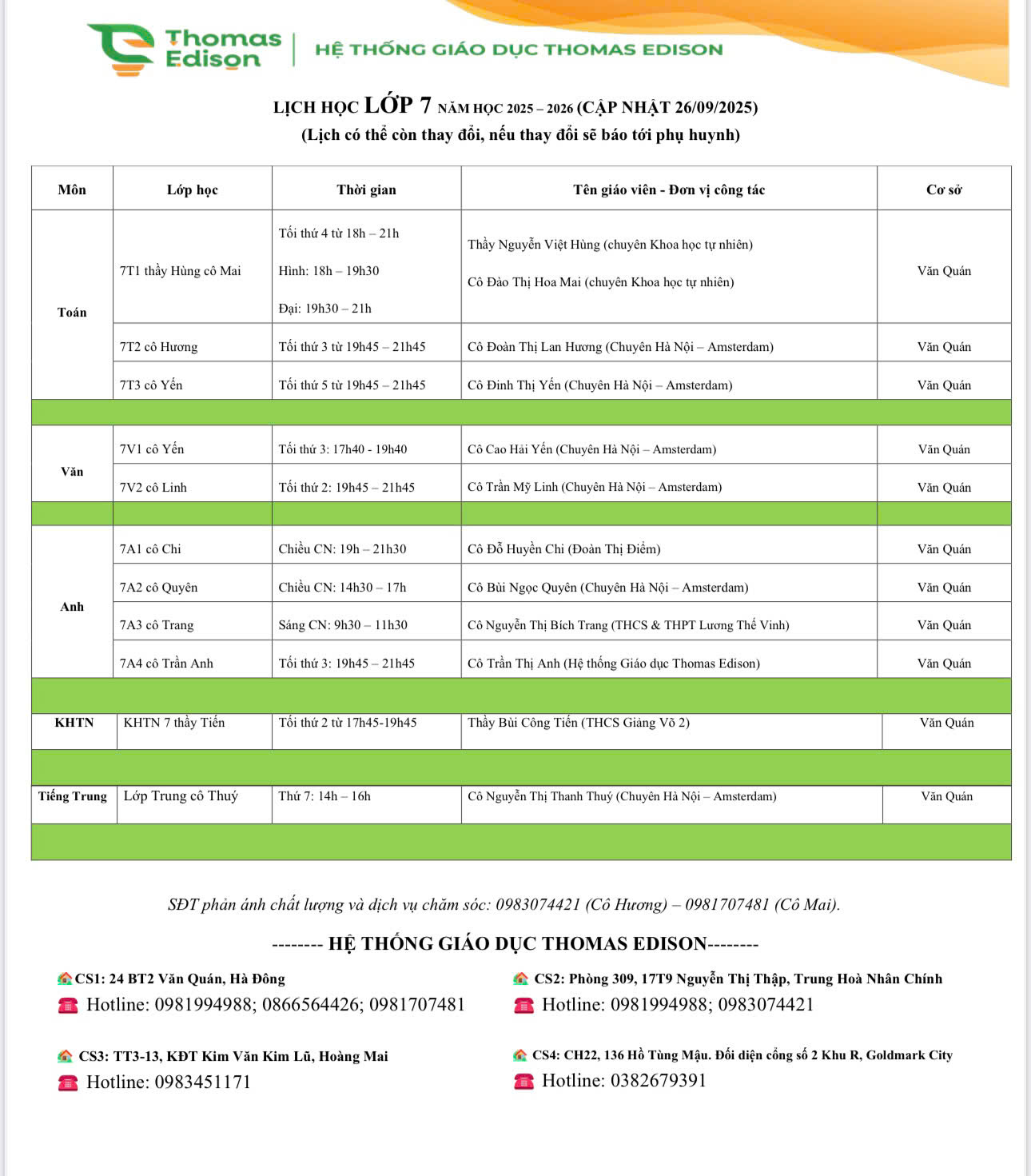 LỊCH HỌC LỚP 7 NĂM HỌC 2025 – 2026 (CẬP NHẬT 09/10/2025)