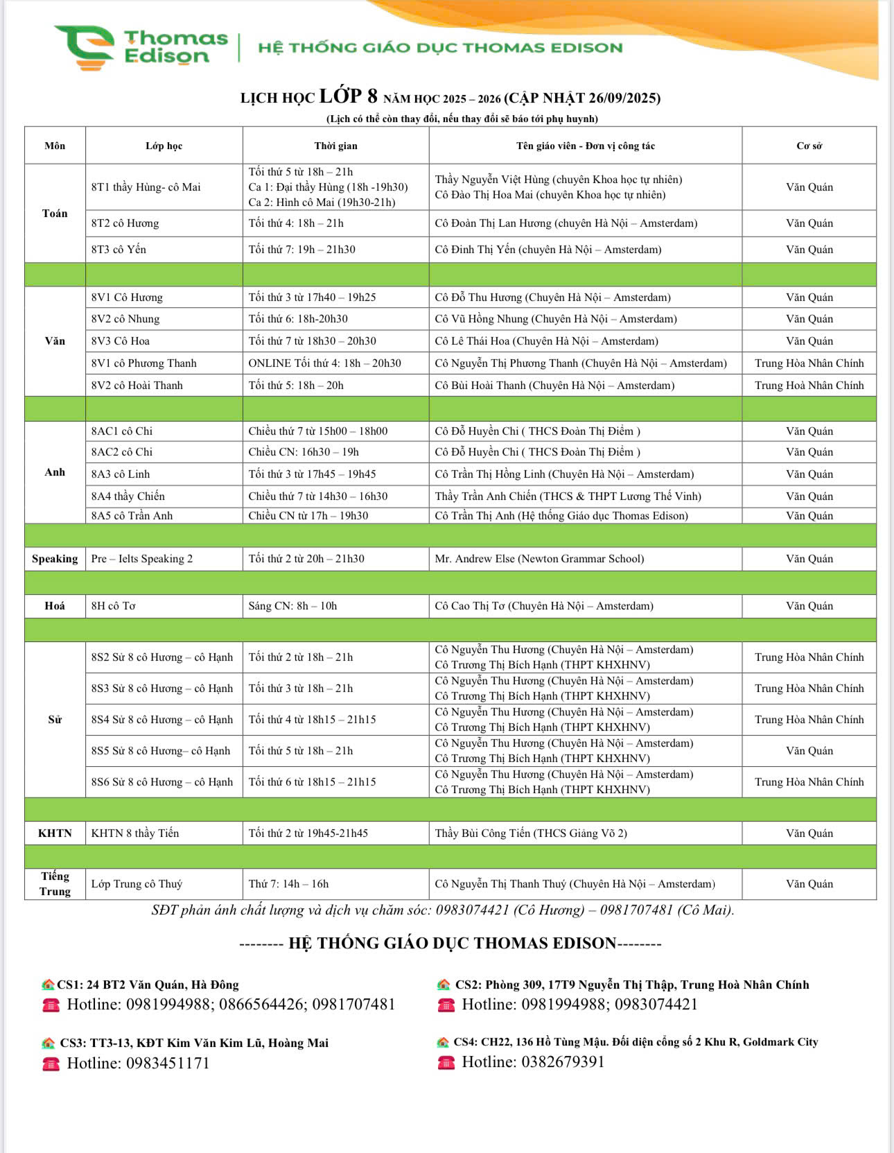 LỊCH HỌC LỚP 8 NĂM HỌC 2025 – 2026 (CẬP NHẬT 09/10/2025)