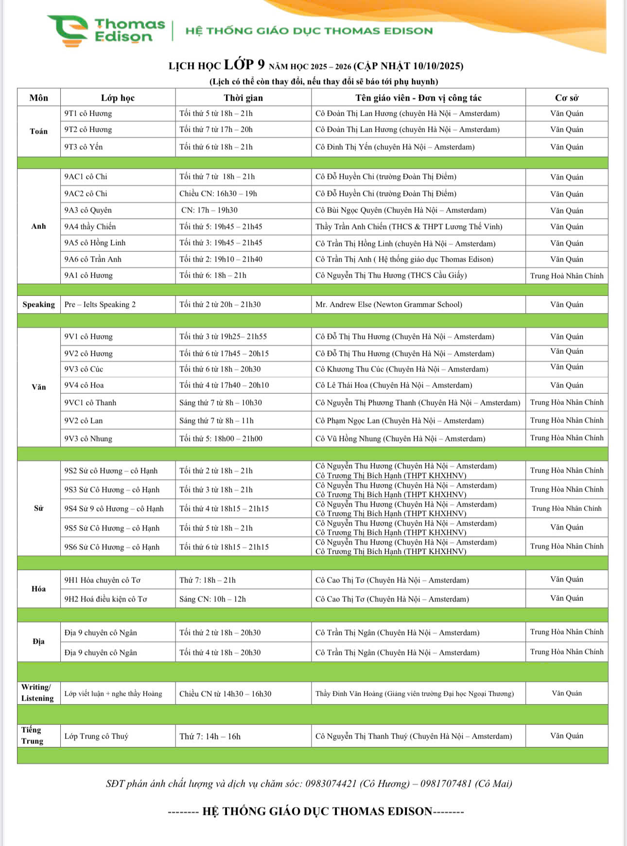 LỊCH HỌC LỚP 9 NĂM HỌC 2025 – 2026 (CẬP NHẬT 09/10/2025)